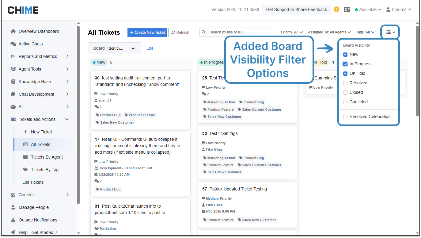 The new Filter By (Board Visibility) option lets users display tickets based on their state — New, In Progress, On Hold, or Resolved.