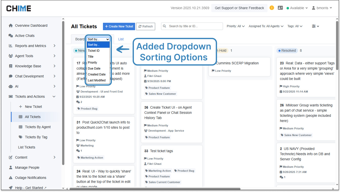 A new Sort By dropdown in the Ticketing interface makes it easy to organize tickets by Ticket ID, Title, Priority, Due Date, Created Date, or Last Modified.