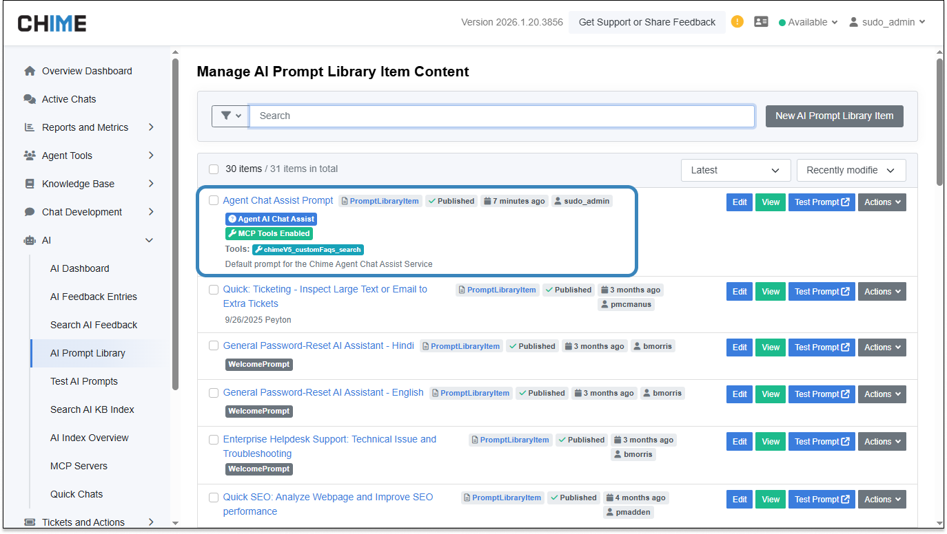 Agent Chat Assist has been upgraded to support Prompt Library–based prompts, allowing organizations to centrally manage, reuse, and refine AI prompts across teams. MCP tools are now supported, enabling more advanced AI-assisted workflows.