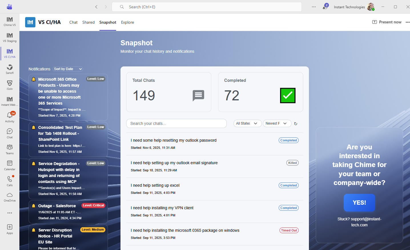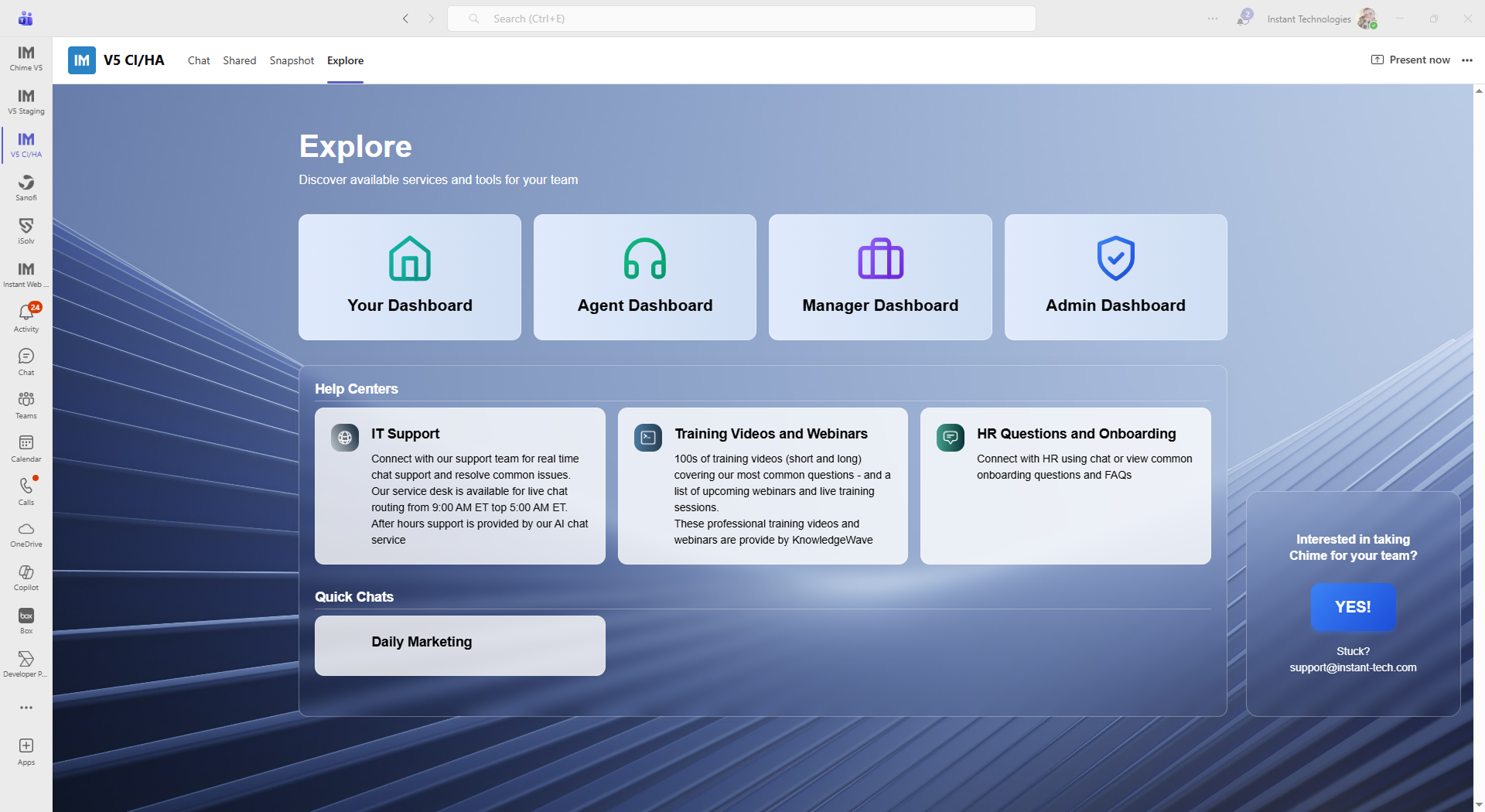 Chime V5 now integrates more deeply with Microsoft Teams through new embedded tabs, giving users a seamless in-app experience. The Snapshot Tab shows real-time notifications, chat summaries, and outage information directly within Teams. The Explore Tab delivers role-based dashboards tailored for Agents, Managers, and Admins. External participants can securely view chat transcripts via the new Guest Transcript View, and a new Share with Decision Makers button allows quick meeting or invite sharing inside Teams.