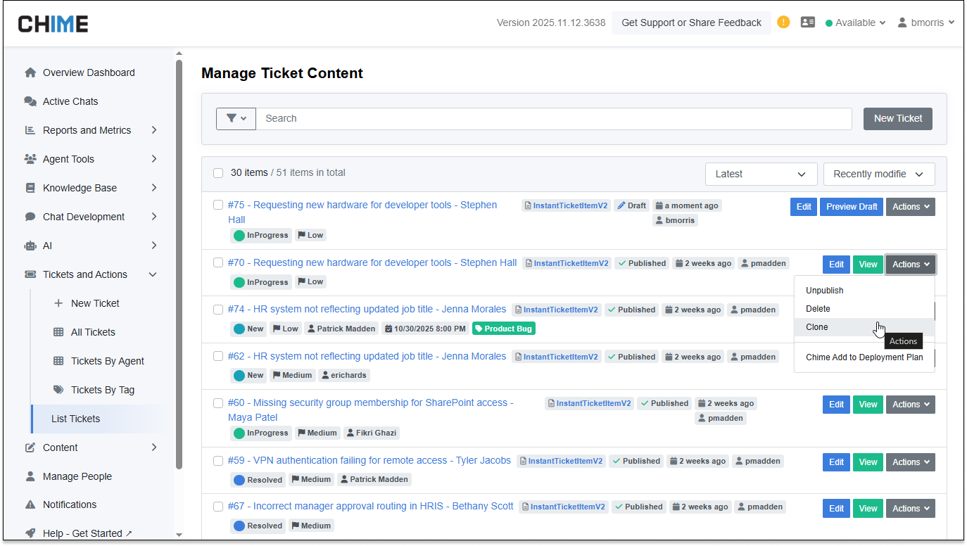 Ticket cloning has been streamlined to simplify creation and maintain workflow integrity. Each cloned ticket now generates a unique Ticket ID automatically, and publishing cloned or draft tickets triggers workflow events without duplication or errors.