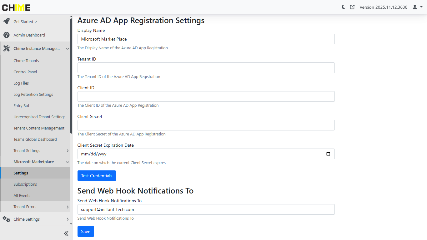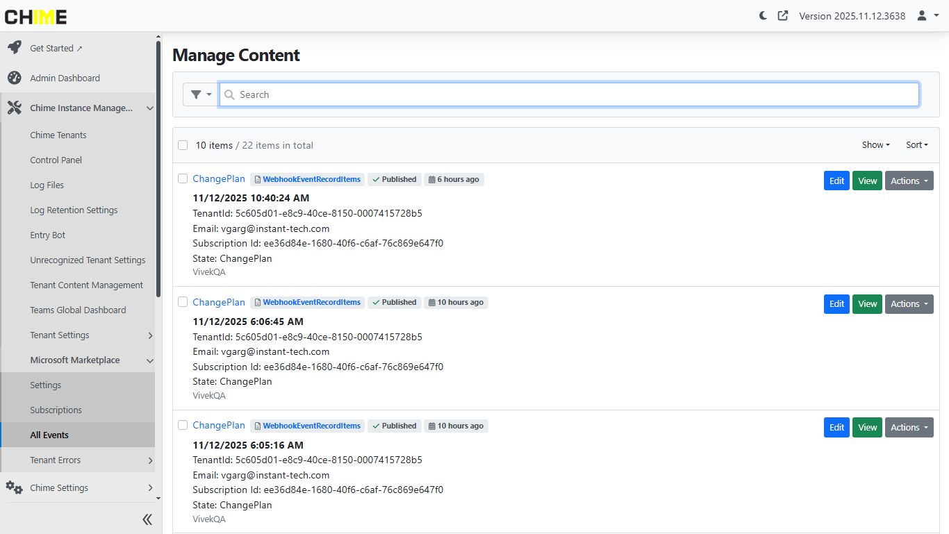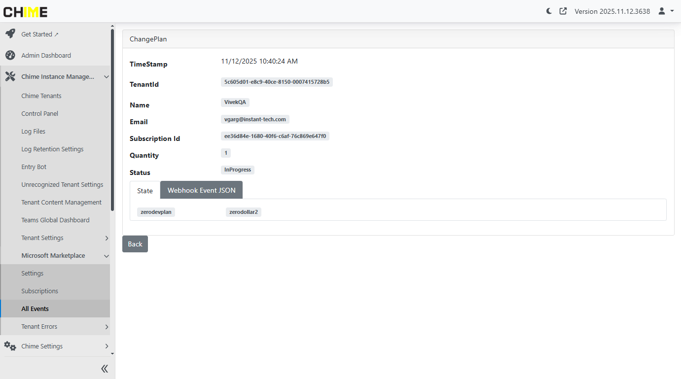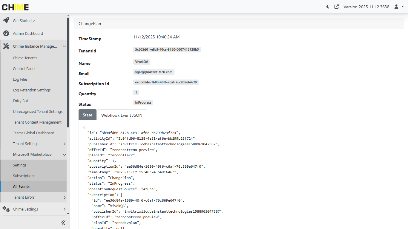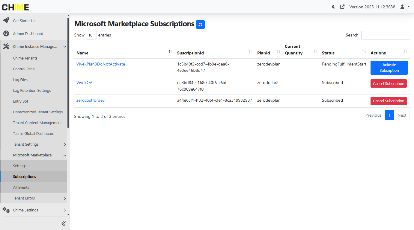 The Chime V5 Marketplace module now offers a more complete subscription management experience. Customers can view subscription status, activate services, and access their Azure Portal directly from the landing page. The module now includes Event Listing and Details pages to track activations and renewals, expanded views showing Email, Subscription ID, Quantity, and Status, and updated styling consistent with Microsoft Marketplace guidelines.