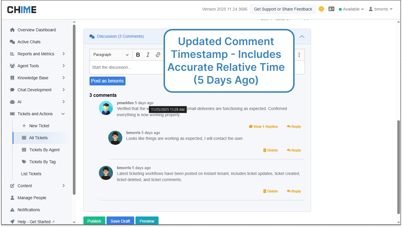 Enhanced Comment Display & Formatting – Ticket comment threads now feature clearer layouts for avatars, timestamps, text, and replies, improving readability and consistency across all tickets.